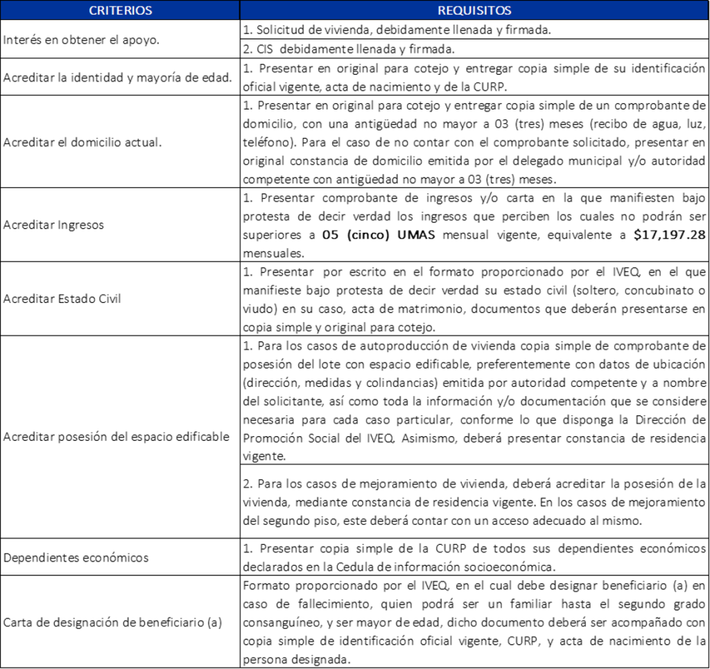 Las personas interesadas deberán acudir personalmente ante el IVEQ con la Dirección de Promoción Social y/o en las oficinas de Desarrollo Social del municipio que le corresponda, y presentar su solicitud mediante la CIS, acreditando el cumplimiento de los requisitos.